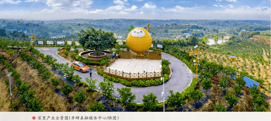 井研“百里产业环线”以杂柑产业为主、生态种养循环及农旅融合发展,采取“绿色 +农业 +旅游 +文化”模式,从果、畜、渔、蔬的循环基地,到专家大院、良繁中心、冷链物流,再到文创基地、乡村民宿、康养中心,绿色理念、智慧产业、共享经济在这里深度演绎。大力发展乡村休闲观光旅游,依托以柑橘为主导的百里产业环线,打造繁荣村为全国美丽休闲乡村,培育长山湖民宿村、橘乐园星级农家乐等 10余处以农业为主题的农旅精品公园,休闲设施配套完善。加强对井研柑橘的宣传,将井研柑橘品牌的宣传融入井研的历史文化、体育赛事、旅游推介、文化艺术创作和表演、各类会展、节庆等各个领域,并作为一条主线之一予以宣传。创作《百里产业柑橘甜》 MTV,编排舞蹈《橘子姑娘》,组织创作农民画,组织实施柑橘采摘节庆、走出井研等活动 30余次,大力提升井研柑橘品牌的内外价值。“百里产业环线”成为四川省文化和旅游厅授予的脱贫攻坚文旅扶贫典型案例。