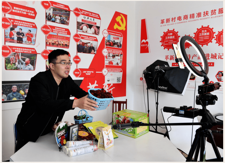2020年6月,商务部下派干部、龙安乡革新村驻村第一书记金达芾正在直播销售当地农产品(张国盛 摄)