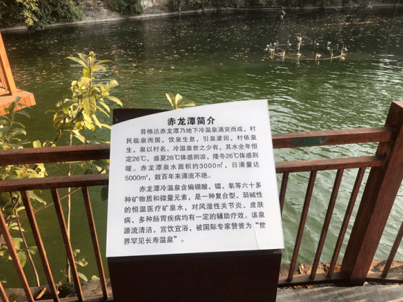 赤龙潭冷温泉含偏硼酸、镭、氡等60多种矿物质和微量元素,是一种复合型、弱碱性的恒温医疗矿泉水,对风湿性关节炎、皮肤病、多种肠胃疾病均有一定辅助疗效。该泉源流清洁,宜饮宜浴,被国际专家赞誉为“世界罕见长寿温泉”。