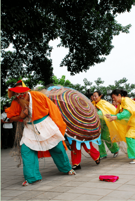 蚌舞,又称“蚌壳精戏渔翁”,南充市首批非物质文化遗产。本剧由兴旺镇老艺人传承,至今已有几十代人历史。蚌舞表演全靠肢体语言和面部表情,是一种独有的民间艺术,诙谐、幽默的表演很受观众欢迎。