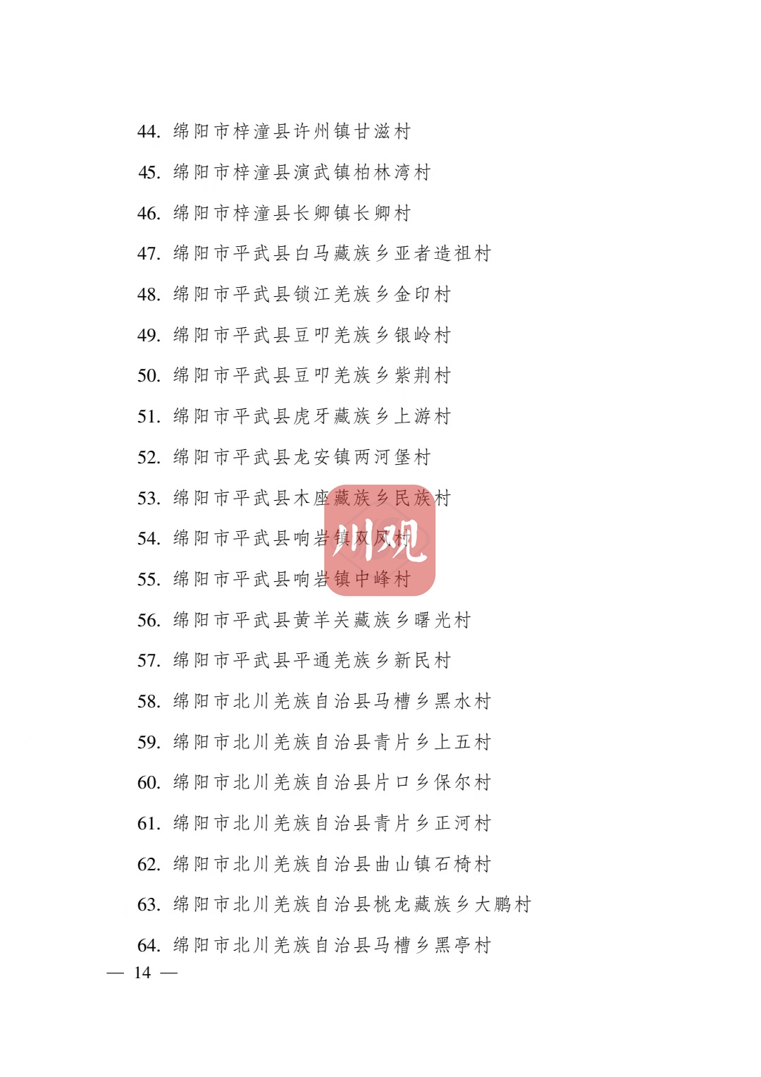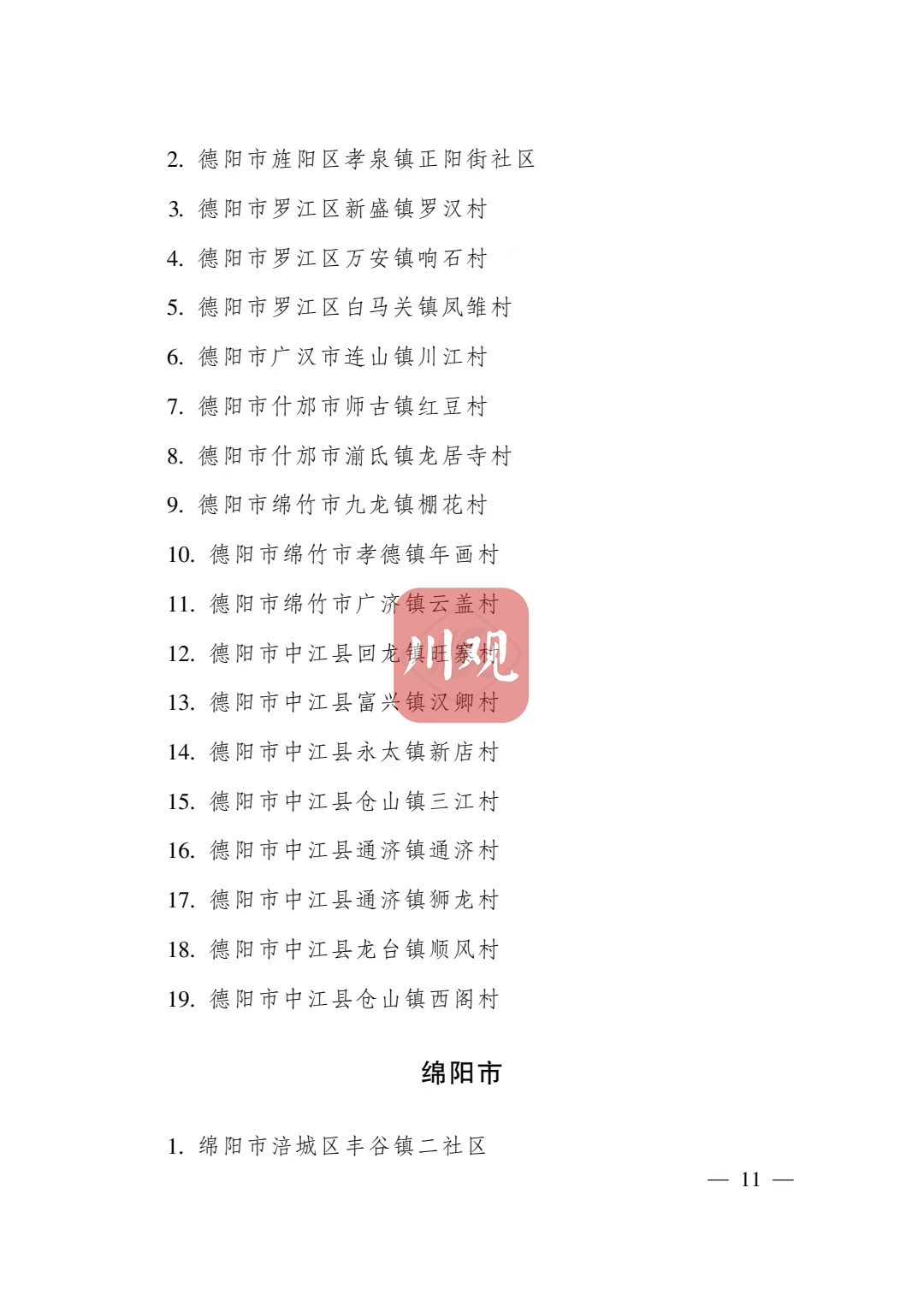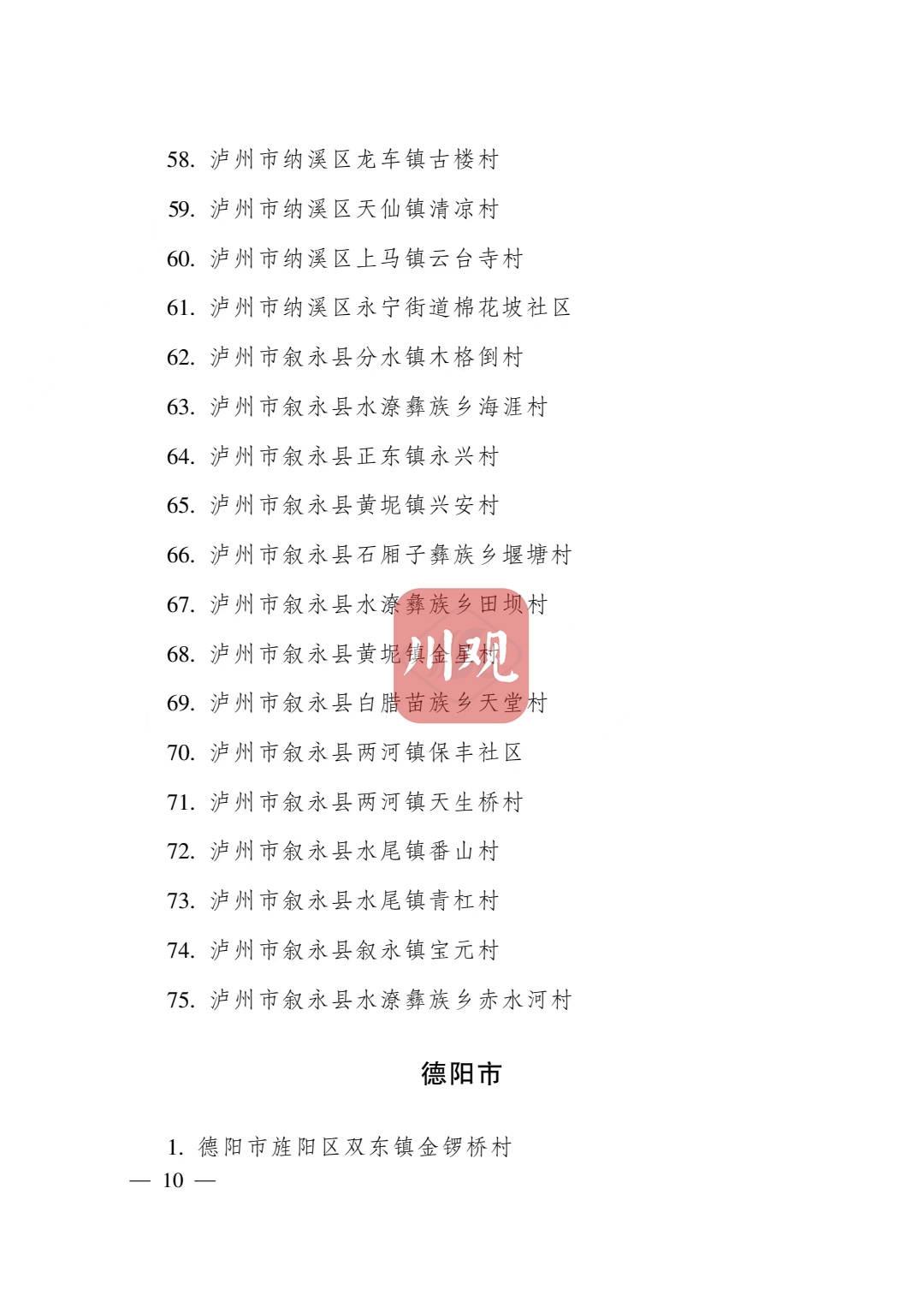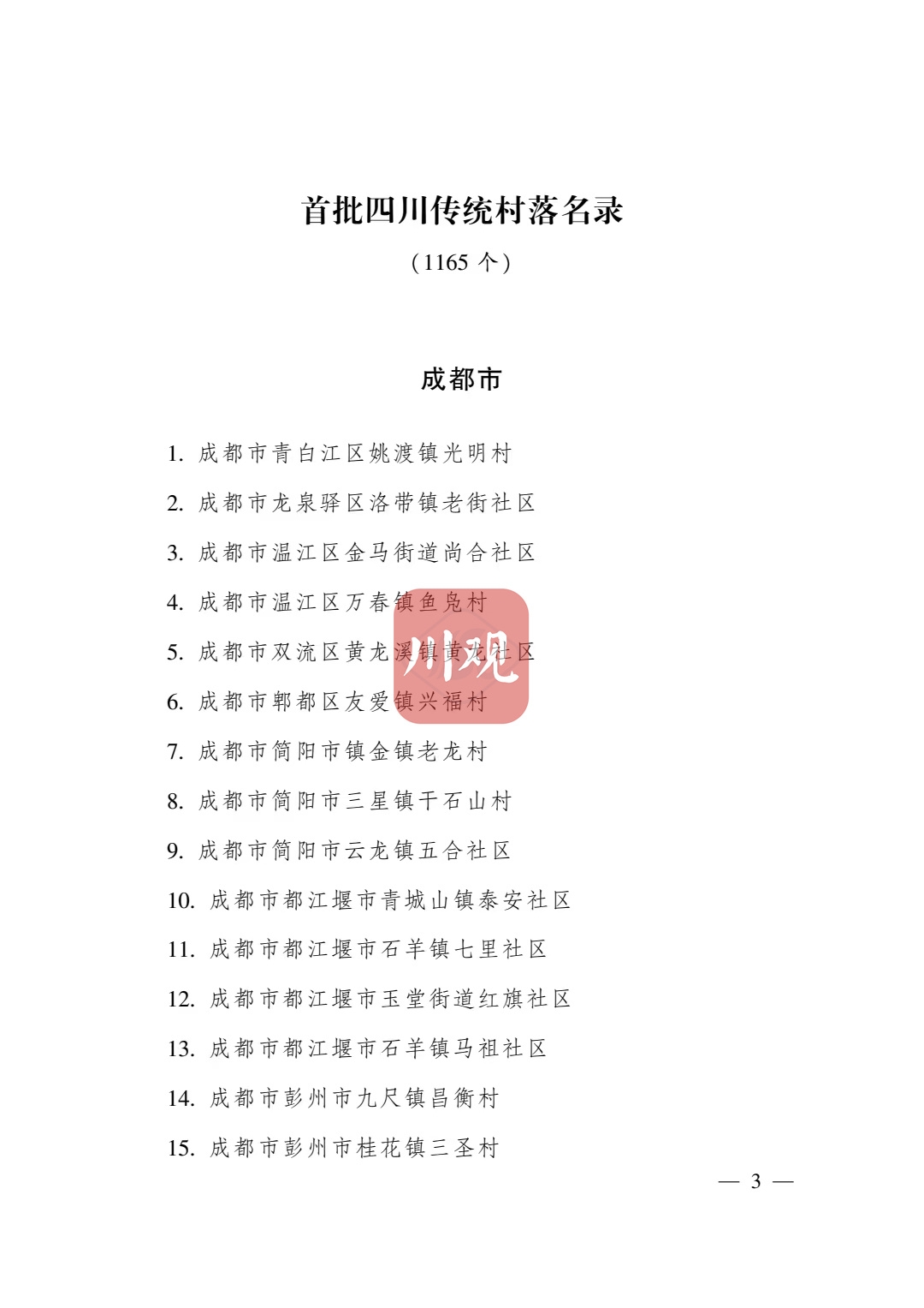 根据《四川省传统村落保护条例》,经各地申报、专家审查并向社会公示,省政府决定将成都市青白江区姚渡镇光明村等1165个村落列入四川传统村落名录,现予公布。