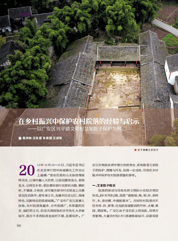 2013年12月12—13日,习近平总书记在北京举行的中央城镇化工作会议上强调:“要依托现有山水脉络等独特风光,让城市融入大自然,让居民望得见山、看得见水、记得住乡愁;要注意保留村庄原始风貌,慎砍树、不填湖、少拆房,尽可能在原有村庄形态上改善居民生活条件;要传承文化,发展有历史记忆、地域特色、民族特点的美丽城镇。”广安市广安区是賨人故地,农村院落数量多、分布范围广,有厚重的历史、灿烂的文化,但受风雨侵蚀和岁月洗礼大多被破坏,现存不多的院落也破烂不堪,急需保护。广安区在精准扶贫中整合扶贫资金,系统推进艾家院子的保护、修缮与开发,取得一定成效,可供在乡村振兴中保护农村院落借鉴和参考。