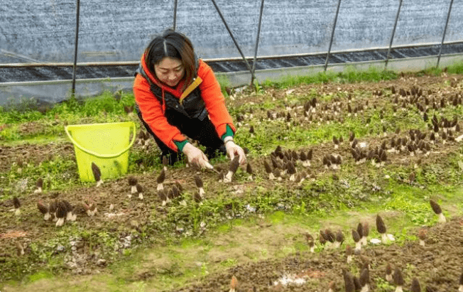 吴小敏在位于涪陵区马武镇文观村的羊肚菌种植基地内进行管护(图片来源:重庆日报)