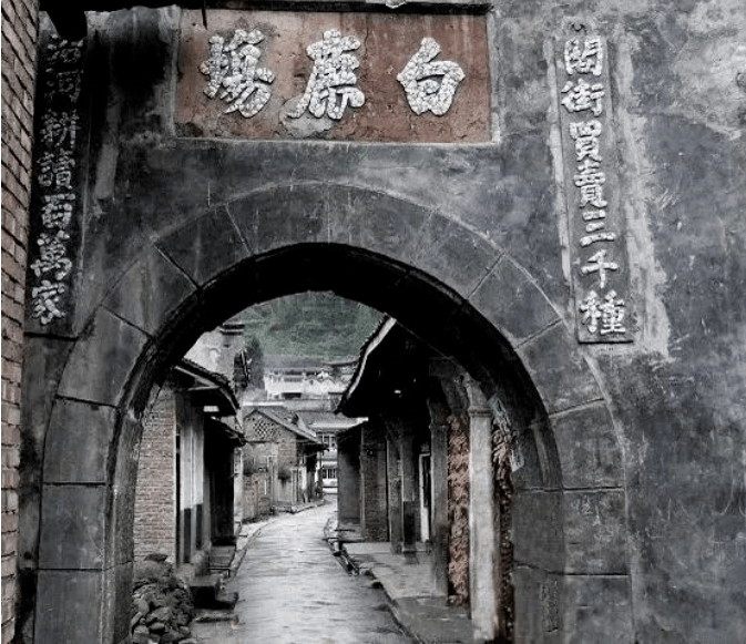 白鹿场俗称河坝场——即白鹿老街,整条老街依河而建,南北长,东西短,形似一只巨船, 场中一条水渠穿街而过,石墙高耸、角楼飞檐,场内建筑为典型的木结构穿梁架。