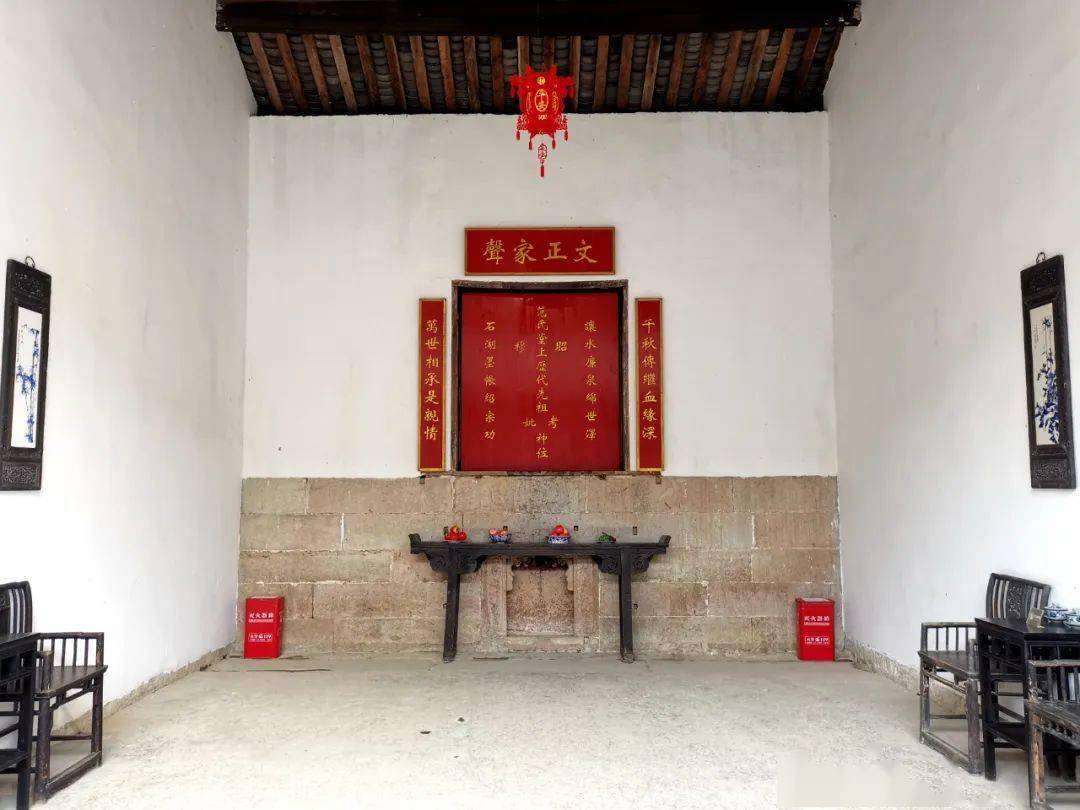 通过中堂屋,就是一个天井,天井中一口古色古香的石缸,一朵睡莲开得正好。天井两侧是厢房,门窗均为精致的木雕,镂空雕花,细看雕花上还残留有金粉,形制规矩透出范家当年的气派。通过天井就是上堂屋,是范家祭祀祖先的地方。正面神龛上写着“文正家声”“范氏堂上历代高曾祖之位”的匾联和牌位,上方悬挂“范文正忠宣奕世遗像”,下方供放着鲜花水果,可以感受到族人感怀先祖的那份情思。
