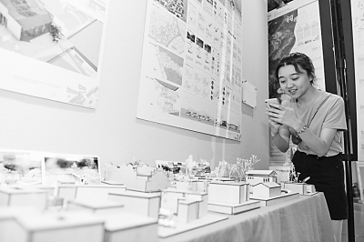 观众在安徽宏村黄山万春艺术馆内拍摄参展作品。新华社发