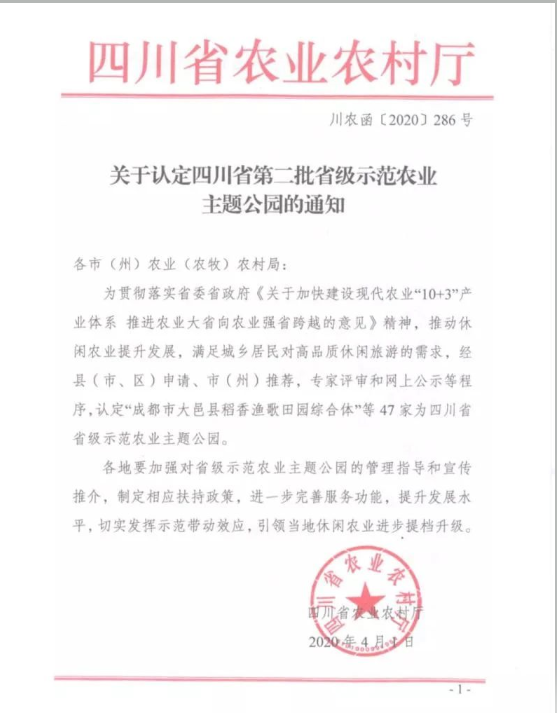 2020年4月1日,四川省农业农村厅印发《关于认定四川省第二批省级示范农业主题公园的通知》,经县(市、区)申请,市(州)推荐,省级专家组评审等程序,在全省范围内认定47家省级示范农业主题公园,兴文县僰王山镇水泸坝农业公园榜上有名。