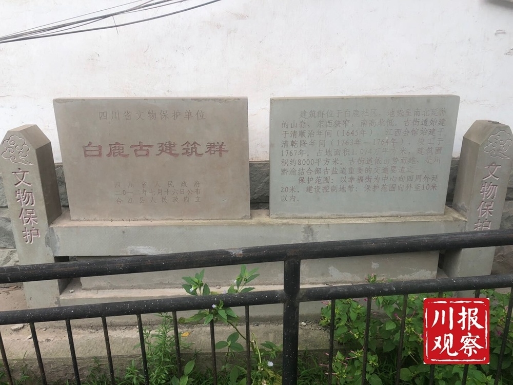 在合江县白鹿镇白鹿社区幸福街入口处,一块刻有“四川省文物保护单位白鹿古建筑群”的石碑非常引人注目,一旁的石碑详细介绍古街道始建于清顺治年间。