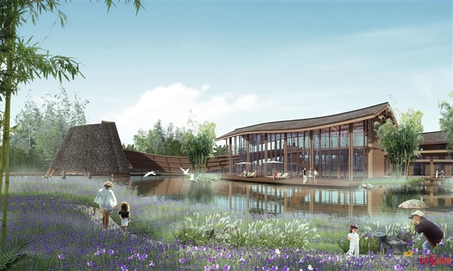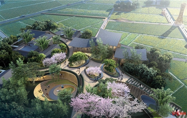 获奖方案之一的“水云间·花田驿”,对自然本底良好,处于空港航线下、位于空港花田景区内的双流黄甲八角林盘进行设计。依托景区资源营造新型旅游消费场景,取空港之云营造云径、云亭、云廊、云阶、云台等“云”主题场所,用水寨之水塑造花溪、方塘、清洞、跌水、镜湖等亲“水”开放空间。滨水活动空间和“云”主题场所共同构成了开放的空间体系,塑造航线下的大地景观。