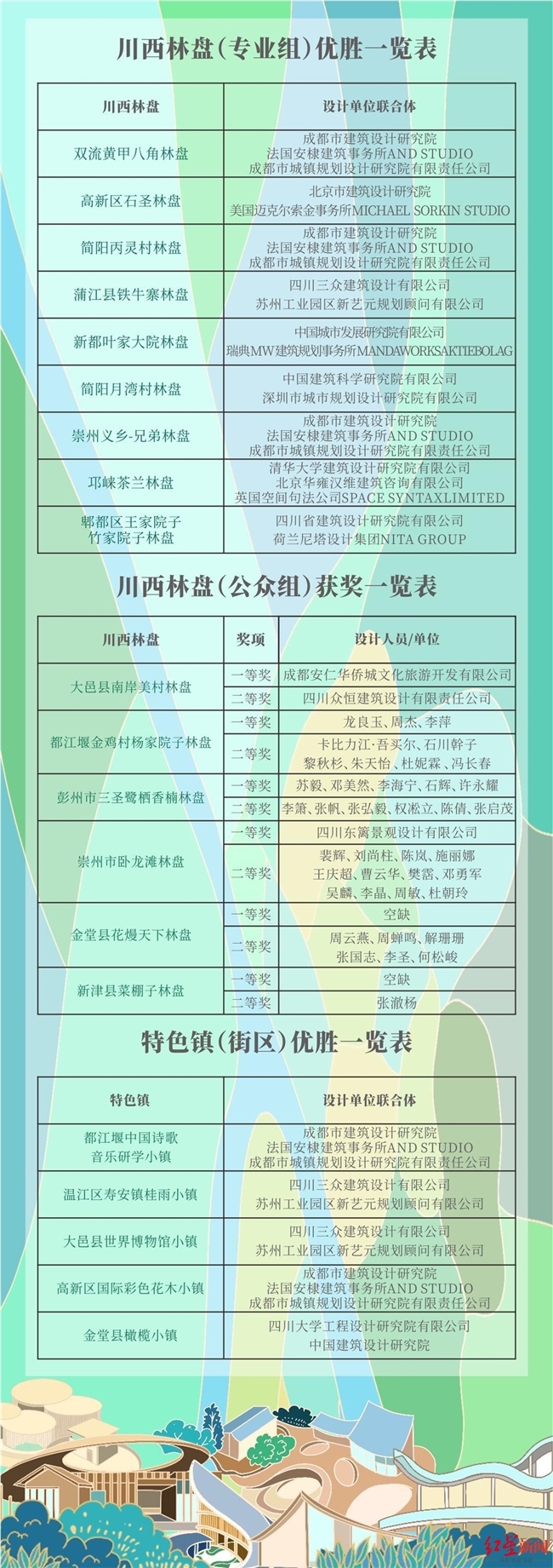 日前,成都市规划和自然资源局、成都市农业农村局发布公告,历时大半年的首届成都市特色镇(街区)建设和川西林盘保护修复规划设计方案全球征集活动优胜获奖方案正式出炉,从来自全球的20家一流规划设计机构和世界各地的174个公众组应征人中,最终评选出了24个优胜、获奖方案。