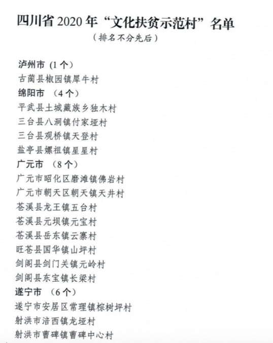 日前,省委宣传部、农业农村厅、文化和旅游厅、省广播电视局、省体育局、省扶贫开发局联合开展“文化扶贫示范村”创建活动,探索文化扶贫的有效路径。对照《四川省贫困地区村综合文化服务中心(文化院坝)建设基本内容和指导标准》,经过县(市、区)申报、市(州)推荐、联合评审、抽查复核、网络公示等程序,经创建成员单位审定,决定命名泸州市古蔺县椒园镇犀牛村等124个行政村为四川省2020年“文化扶贫示范村”。