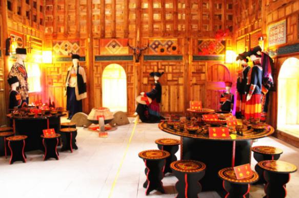 入口牌门由6根立柱支撑,上边有平台和人字形顶篷,有贵客和来宾光临,热情好客的彝族儿女,便在牌门设迎宾酒和送客酒,敬上亲手酿制的美酒,以示欢迎、欢送和祝福。