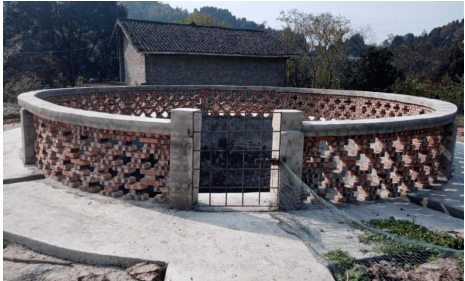 在一家农户院子附近,有一座圆圆的蓄水池,盛着半池水。水池的围墙边有一道缺口,那是一扇铁网门。门里面有几级石梯通到水池底部,便于村民取水。