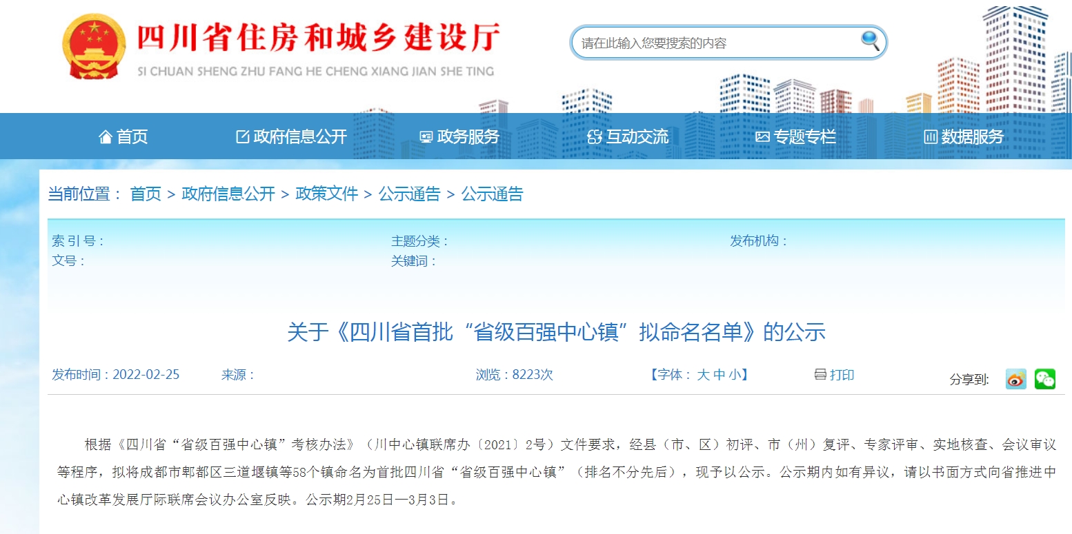 近日记者从四川省住建厅官网获悉,《四川省首批“省级百强中心镇”拟命名名单》正在公示,公示内容如下: