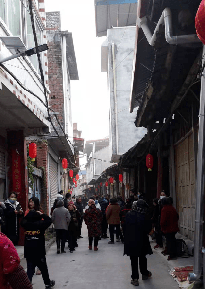 这天正值逢场。我走进一线天似的清洁明亮的街道,仿佛又回到了那年少时代,看到了场镇的繁荣和兴旺。长长的独街上人声鼎沸,人来人往,大红灯笼挂满了街头,家家户户张灯结彩,浓浓的年味喜庆迎面扑来。一缕阳光从街道两旁的房檐下洒落到街面,映红了大爷大妈喜庆的笑脸。宽窄的凉衣柱街沿上,两边摆满了各种蔬菜、水果,全是货真价实的绿色产品。场镇的中部是繁华地段,来自白鹿幼儿园的孩子们,穿着红红的服装,正在街阳上演出少儿节目“中国红”,那一团团火焰,让我想起了盛开的牡丹花,她们是乡村振兴的未来,火红的希望啊。少儿刚下场,涂脂抹粉的老年歌舞队又吆吆伙伙上场了。