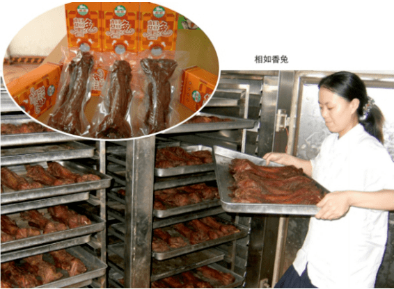 相如香兔由徐家镇相如香兔加工厂出品,以引进优良的齐兴、奇卡、比利时、加利喜利亚、大耳白兔种杂交繁育的肉兔为主要原料,经过多道工序烤制而成。相如香兔蛋白质含量高达70%以上,是猪肉、羊肉、鸡肉、牛肉蛋白质含量的2—3倍。兔肉中还含有多种氨基酸,其中人体必需的氨基酸、赖氨酸和色氨酸的含量也高于其他肉类;无机盐、维生素含量也很丰富,是猪牛羊肉的3—4倍;胆固醇含量较低。长期食用是预防高血压、肥胖症、冠心病、动脉硬化的理想食品。