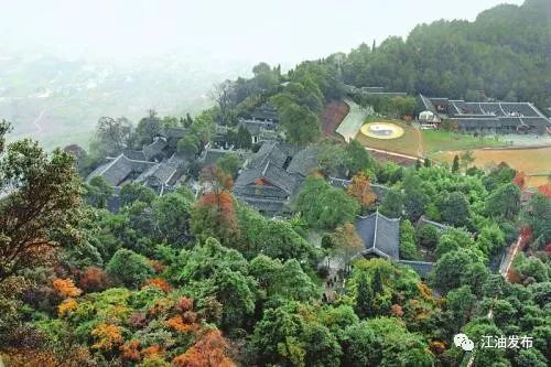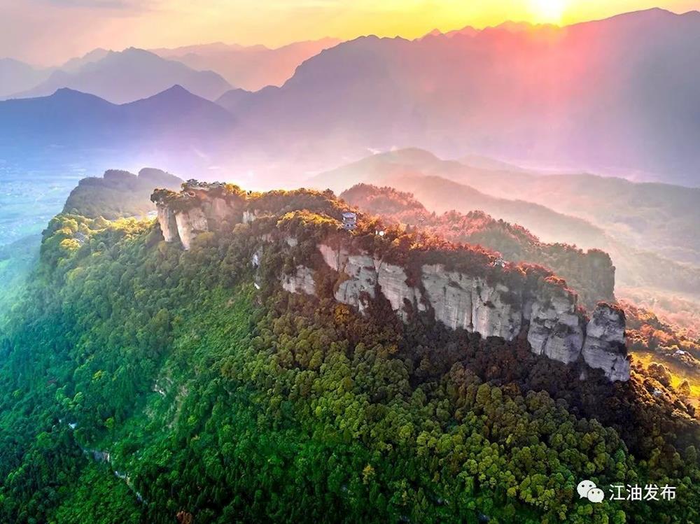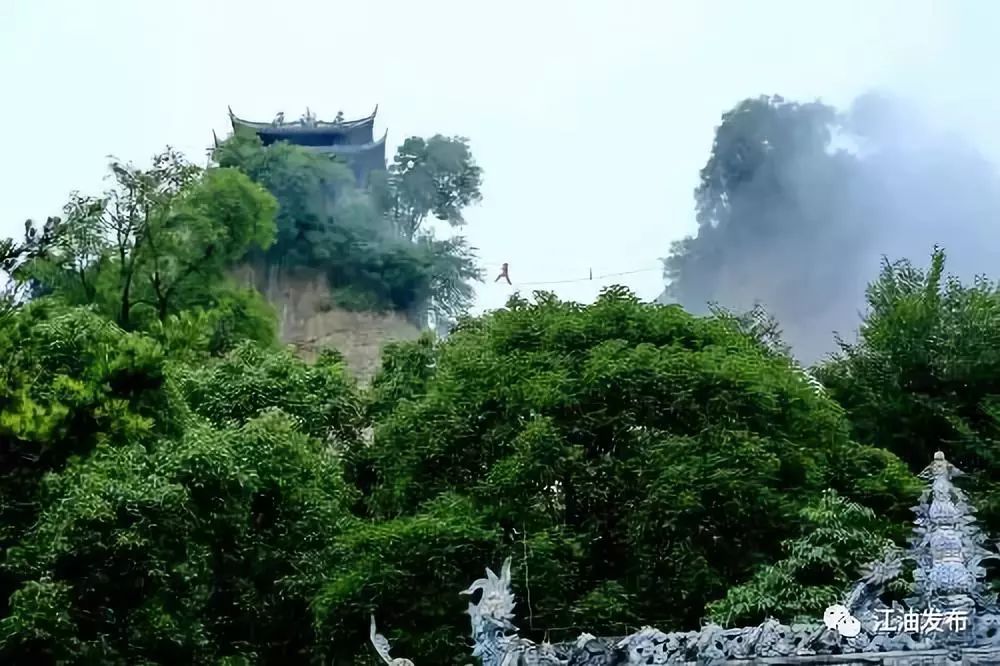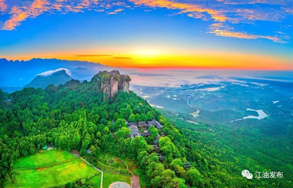 站在窦圌山顶的东岳峰,游人看到的却是绿茵茵的坦平原野,涪江如一条飘带,仿佛就在眼前飞舞。富庶的江油中坝尽收眼底,令人心旷神怡、物我皆忘。