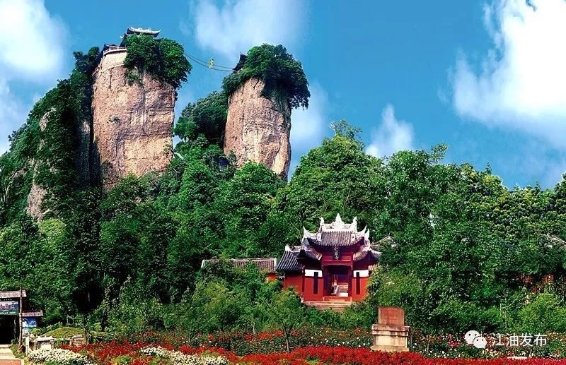 窦圌山坐落在江油城北25公里处的涪江东岸,由于在富庶的川西平原突兀而起,便足以以仅海拔1140米的身躯雄视四方。窦圌山有三座标志性的高峰,分别为东岳峰、飞仙峰和神斧峰。远远望去,三峰高耸入云,矗立如屏,令人感觉那幅巨大的屏风背后,有一方与世隔绝的天地。这山形奇异、古风盎然的自然景观,令少年李白浮想联翩,写下了“樵夫与耕者,出入画屏中”的优美诗句。