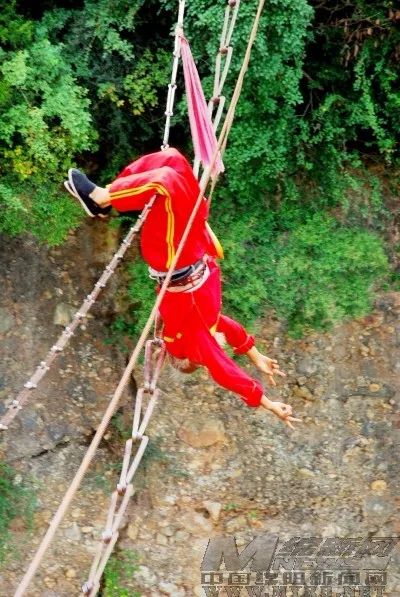游人观看到的在铁索上高空行走表演,有人称之为死亡舞蹈。表演者杨海平自13岁拜云岩寺的常聪法师为师,练就了在铁索上既能行走自如又能做各种具有观赏性动作的绝技,终于成为一代“飞人”,如今竟然以此为业,也为窦圌山景区增色不少。他气定神闲地行步于铁索之上。他先是徐徐地如云中漫步,继而抬腿如金鸡独立,然后伸展双臂如白鹤亮翅,其间不时突然翻身腾挪作失手坠崖状……观看表演的人们不时发出惊声尖叫。