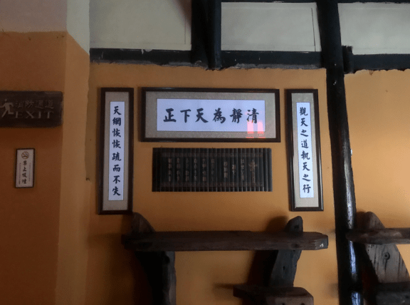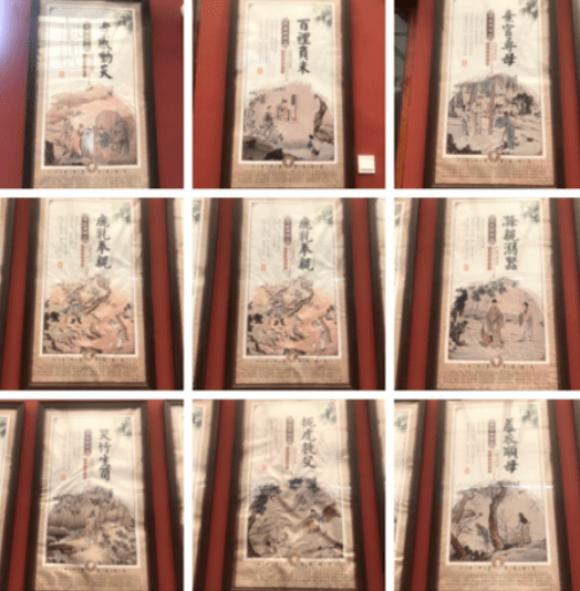 孝敬老人是中华民族的传统美德,我国古代有不少孝子的故事。其中,流传甚广的是“二十四孝”。在古娘娘庙道观走廊墙壁上,醒目地悬挂着讲述二十四孝故事及图片的大幅镜框。