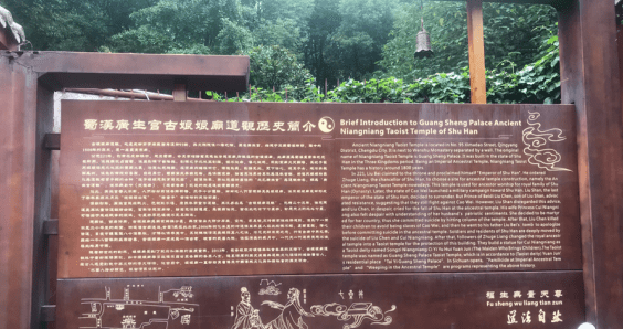 古娘娘庙道观门前一个巨大简介牌告诉我,这座庙宇的全称叫“蜀汉广生宫古娘娘庙道观”。
