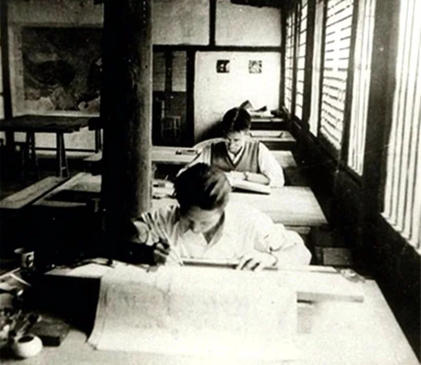 梁思成(后)与莫宗江(前)在李庄中国营造学社办公绘图(图片来自网络)