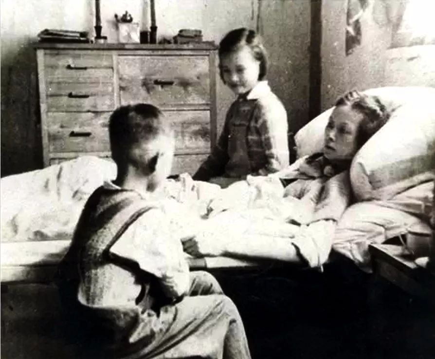 林徽因在李庄月亮田家中病榻上,女儿梁再冰、儿子梁从诫陪伴左右(图片来自网络)