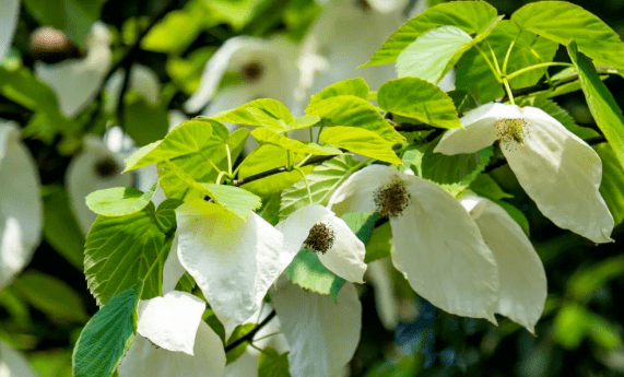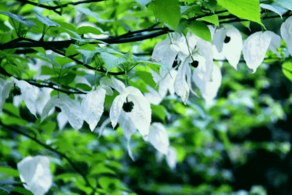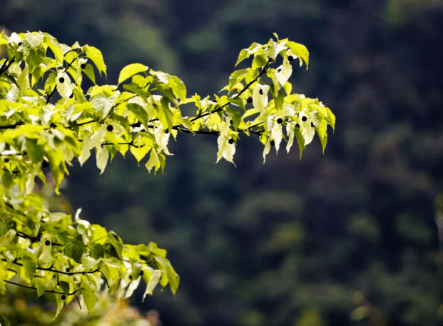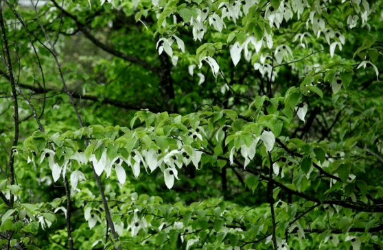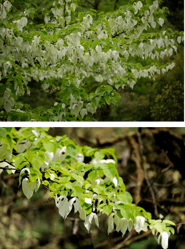 每年3月至5月开花时,在万绿丛中,珙桐像天使般展翅人间,犹如对对白鸽展翅,欣欣然欲飞出林涛绿海。