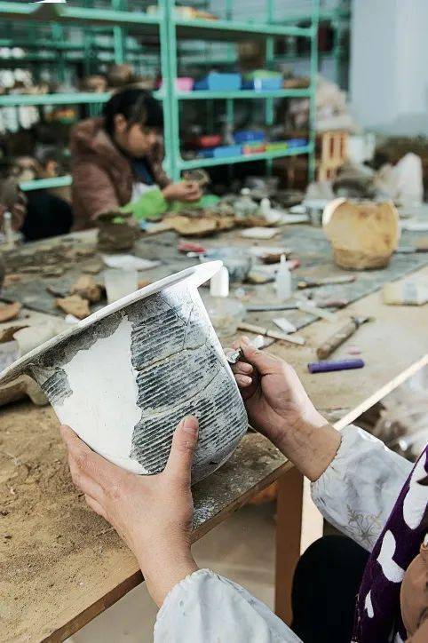 文物工作者正在修复宝墩遗址出土的文物(袁蓉荪 摄)