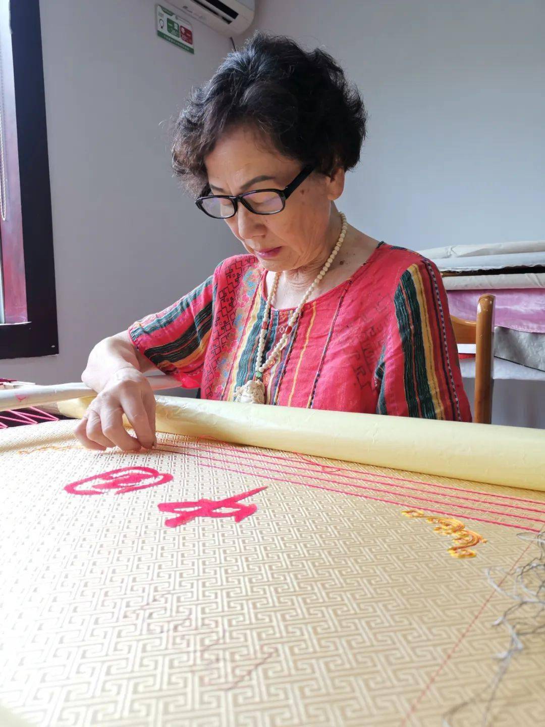 时间紧、任务重,郝淑萍接到任务后,首先琢磨如何让“中国”两字“亮起来”。她带领团队开始用不同红色丝线进行试验。她们每天工作8个小时以上,将不同红色和黄色蚕丝线分成100丝,每一针用6丝线、5丝线、2丝线交替绣,进行不同组合尝试。“每丝线都是用手工来分,靠的都是经验和技艺。”7个月来,她们分丝线的手都已经留下了细茧。功夫不负有心人,经过无数次失败后,她最终选配到了最佳方案:用三种红色丝线配正黄色丝线的方式来制作“中国”。作品中“中国”艳丽的红色并不失沉稳,在灯光的照耀下,“中国”两字光彩夺目,熠熠生辉。