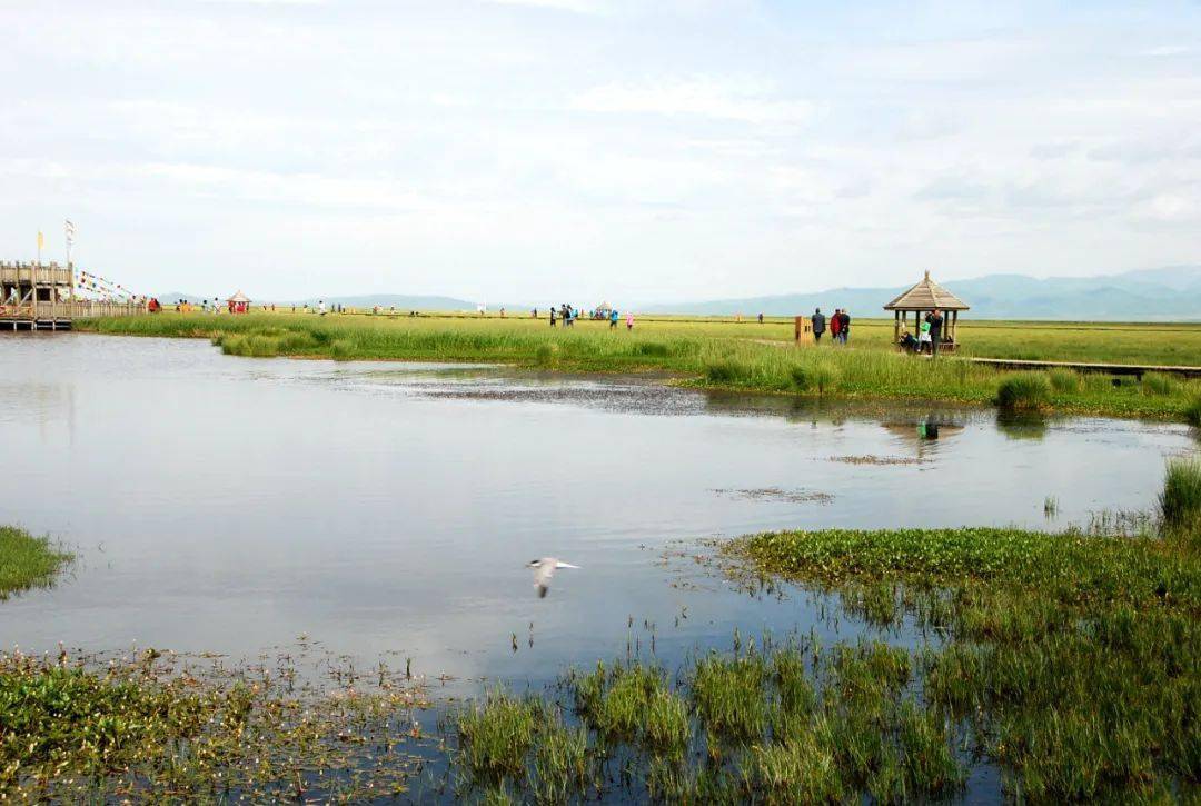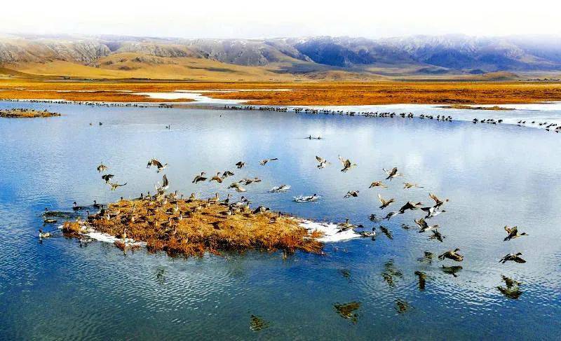 水草丛生的湿地,时不时会遇见灰鹤、野鸭、赤麻鸭、斑头雁、天鹅、老鹰、“会游泳的鸡”……大家看到这样的场景,忍不住拍照。时不时有鸟儿从天空中掠过,它们好像就是为了配合大家拍照似的。