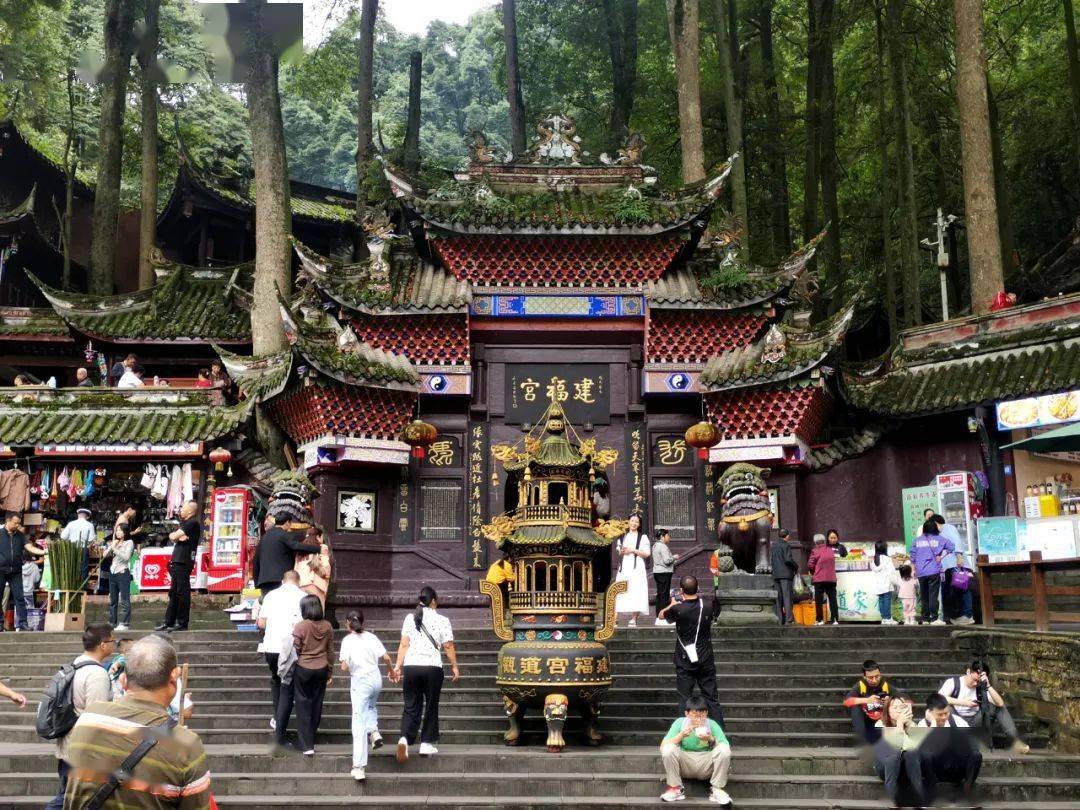 先到访的,自然是位于前山山门左侧的建福宫。该宫始建于晋代,原址在青城天国山中,唐开元十八年(公元730年),奉敕迁于今址。这里后有丹岩翠林掩覆,前有亭楼映衬。我在山门欣赏了著名书法家董寿平先生手书楹联后,再沿着苍楠翠覆的石级梯转折入宫时,热汗顿消了一半。
