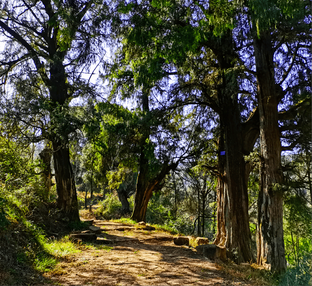 古道蜿蜒,劈山开路、伸向远方。古柏参天,扎根大地、枝繁叶茂。