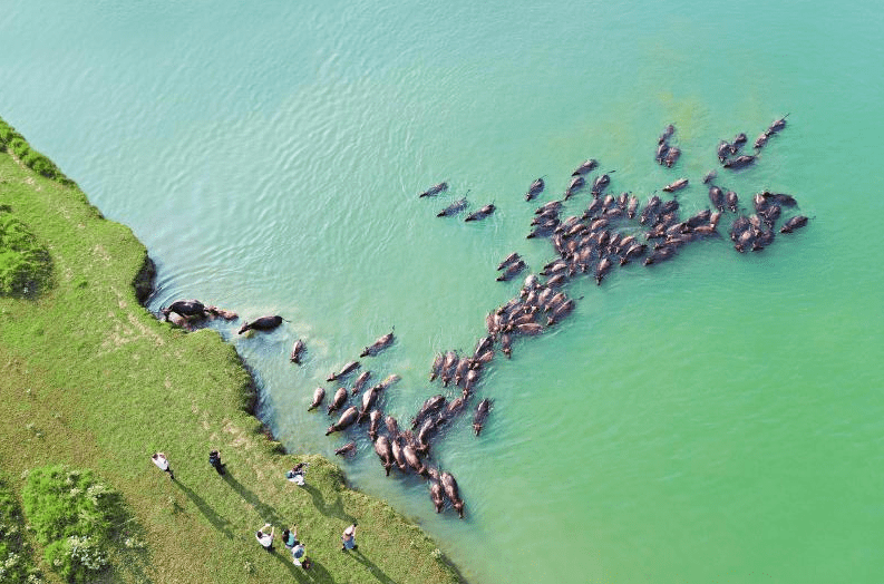 每年4月至10月,四川省蓬安县嘉陵江边的“百牛渡江”景观,吸引众多游客前往旅游观光,有力地拉动了当地乡村旅游业的发展(周亮 摄)