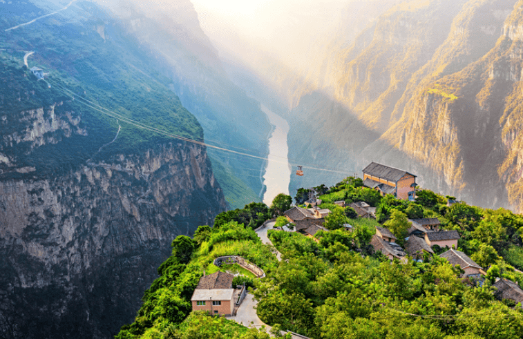 大渡河在汉源乌斯河和乐山金口河之间急剧下切,又准又深拉出一道深深的切口,这就是大渡河大峡谷。大峡谷宛如一条巨大的地缝向远处蜿蜒,气势雄伟,壮观秀丽。悬崖之上,是让人晃神的古老村落古路村。古路村曾经是汉源县最贫困的村落,位于大渡河大峡谷入口的“一线天”右侧绝壁上,被称为“悬崖上的村庄”。2016年国家投资建成一条悬空索道,缆车往来,才解决出行难。而依托高空索道、峡谷风光和淳朴的彝族村落风情,古路村吃上“旅游饭”,彻底摘下了贫困村的帽子。
