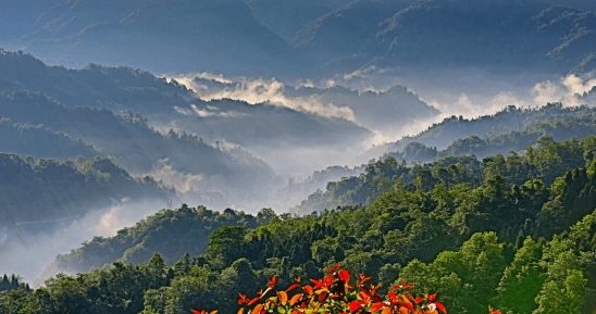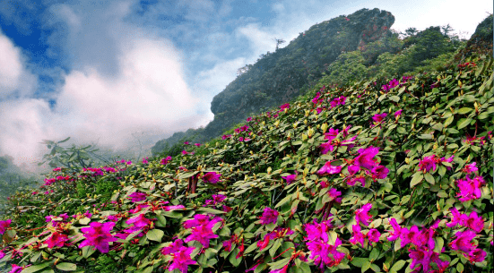 坐落于什邡的蓥华山,古称章山、章洛山、亦泛称大蓬山,自古以来为川西胜景。山峰耸立,溪潭清碧,景色卓绝,有“五绝四海”(看日出、观云瀑、赏佛光、品圣灯、逛花山,云海、雾海、林海、花海)之胜;山高林密,植被丰茂,生长着珙桐、红豆杉、冷杉及20多种高山杜鹃等珍稀植物,故有“蓥华叠翠”之美称。