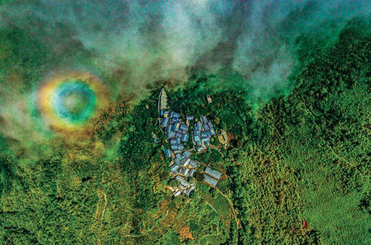 雨后清晨,薄雾从山间升起,随着微风从堡子周围飘过,灰色的石墙,青色的石板,在白色的云雾中若隐若现;太阳把自己的影子投射到云雾上,一轮佛光格外显眼,一束束金色的光线穿云而过,云端上的堡子瞬间明亮而秀美。