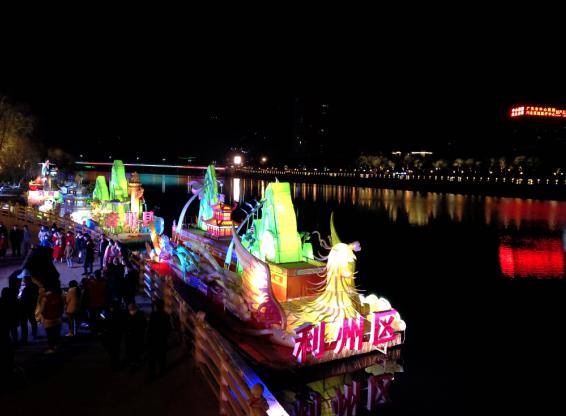 正在惊奇叹羡之时,透过树林看过去,河中一条大彩船扯住了我的眼球。红黄交辉,蓝紫缥缈,叫人心仪。穿过疏疏的柳林,沿着斜斜的小径走近去细细一观,扎的竟是剑门关楼、凤凰楼、千佛崖和城墙的组合,惟妙惟肖,象形与写意相通互融,概括出本土的点睛之笔。灯火泛出风土悠然的韵味,色彩衬托出文化沉淀的深厚,寓知于乐,匠心独运。在指认辨识之中体验着艺术创造的莫大享受,思接千载,视通万里。