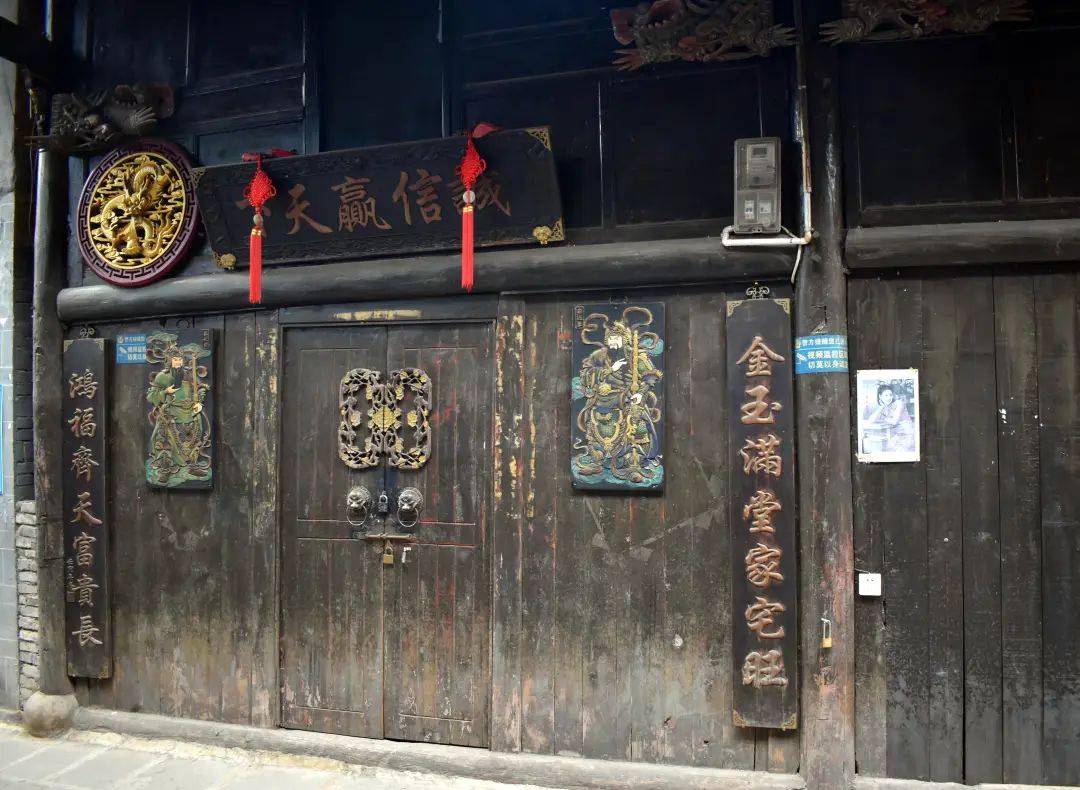 我顺着小巷一直往前走,巷子里静静的,长长一溜木板门面大多关得严严实实,似乎很久没人居住了。一处厚实古拙、漆色斑驳的院门上方,“诚信赢天下”的牌匾被斜射过来的阳光映照着,明晃晃很是耀眼,一副“金玉满堂家宅旺 洪福齐天富贵长”的阳刻楹联,伴着威风凛凛的门神秦琼与尉迟恭分列左右。门庭的木头质地已经陈旧,曾经鲜艳的色彩也很黯淡了,想必多年前,这里也许住着镇上的大户人家,或者就是一家商号钱庄。