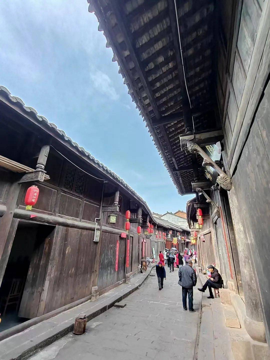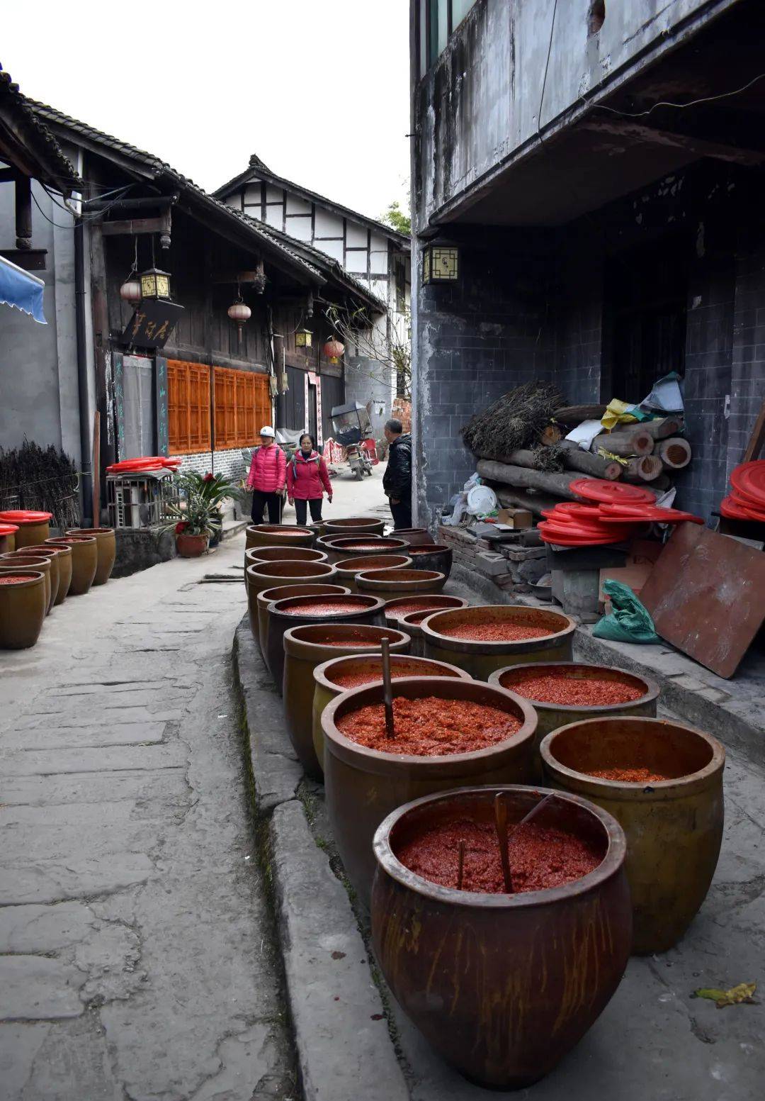 隔着老远,看见小巷深处对列摆放着几排黄褐色陶制大缸,走近细看,原来是一户制作豆瓣酱的作坊,二十来个硕大的陶缸里盛满了正在晾晒发酵的辣椒酱,鲜红夺目,煞是好看。一旁老屋门前,长椅上坐着晒太阳的两位老人,见我从面前经过,都抬起脸来对着我笑。