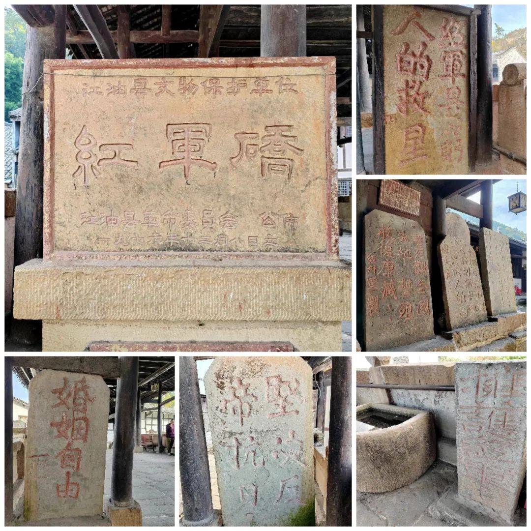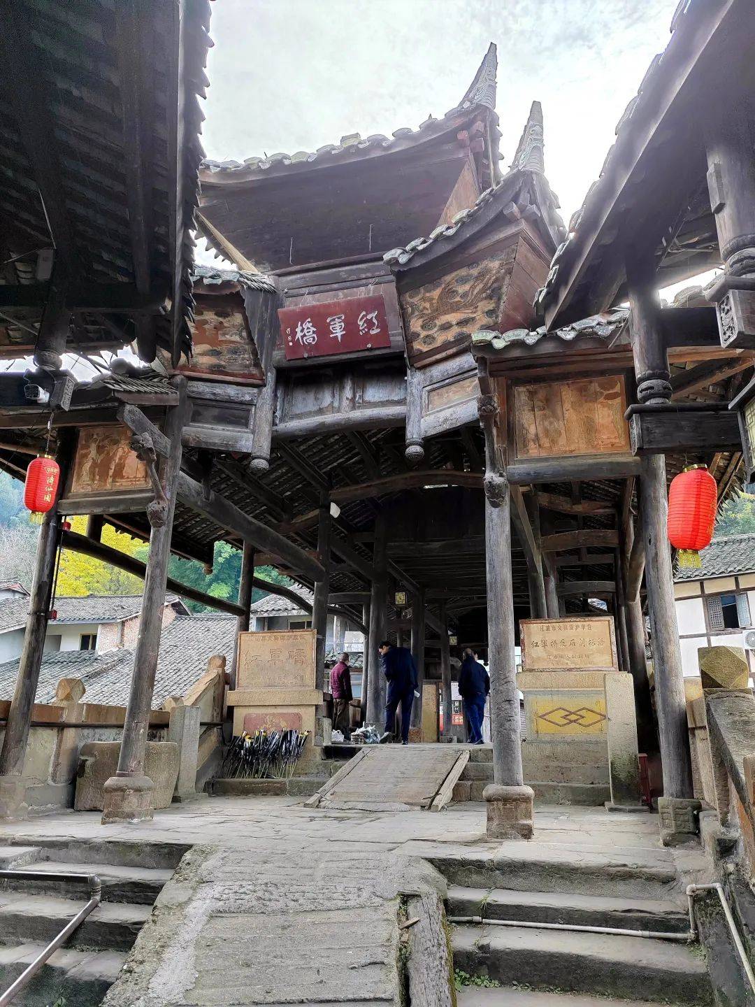走上这座古朴的小桥,我在桥上缓缓走了几个来回,细细体味着个中那份厚重的历史烟云。明艳的阳光下,十多支暗朱色粗大廊柱默默地伫立着,有力地支撑起桥楼的飞檐屋顶,那些原本粗粝的石桥护栏和青石桥面,桥两侧刻有“红军是穷人的救星”“婚姻自由”鲜红字样的石碑,也都被覆盖上了闪烁的光影,这景象不禁让人有些思绪联翩。显然,经过岁月风雨的洗礼,这座小桥已经不再仅仅是一座桥了。