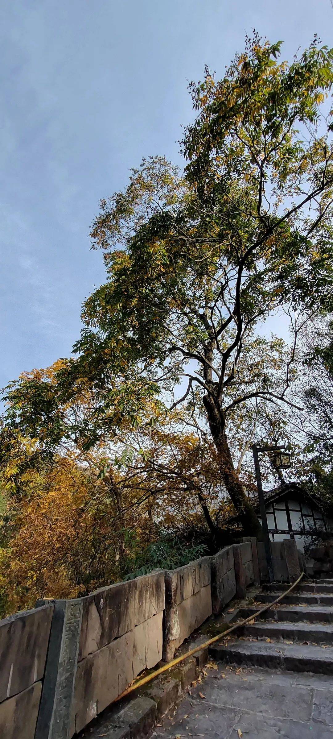 驻足树下,仰头望向树冠,但见一树枝叶嵌入天际,因为季节的原因,虽有凋敝黄叶间杂其中,却依旧枝繁叶茂,直耸蓝天。在路边写有“菩提神树”字样的石头上静坐片刻,时有和风阵阵,间闻鸟鸣啾啾,一时间,不觉气定神闲,宠辱皆安,颇有几分脱俗清心之快慰。