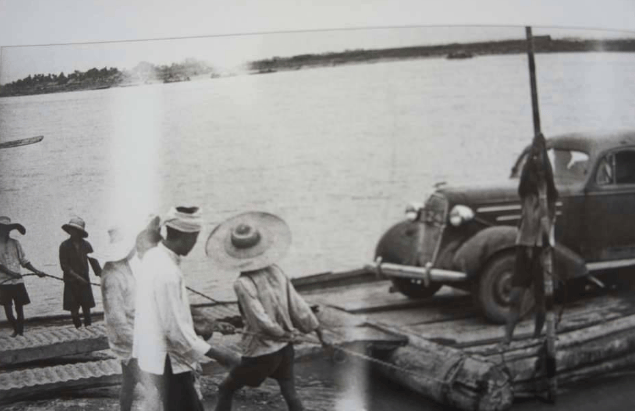 1944 年8 月10日,雅安青衣江上竹排摆渡小汽车渡江(孙明经 摄,图源:四川雅安)