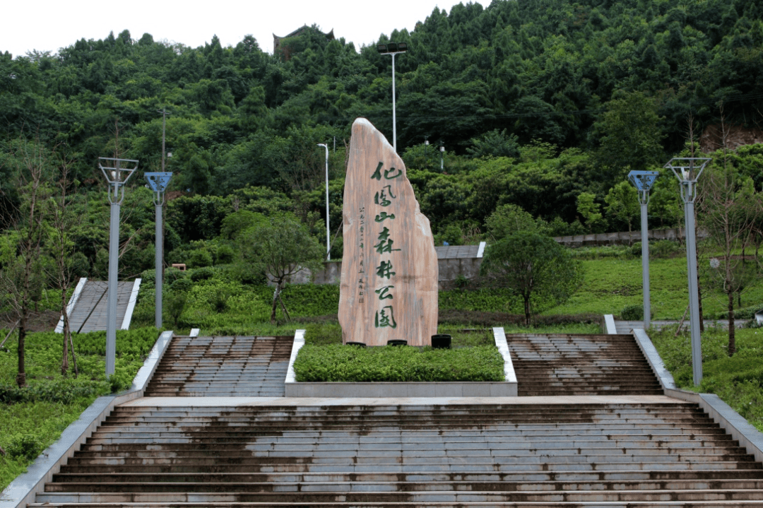 化凤山公园,1995年7月动工兴建,1998年完成主要景点建设,占地2300余亩,森林茂密,峰峦叠翠。仿古式安汉楼2楼1底,以楼代门,重檐叠瓦,风铃鸣响,红墙黄瓦,金碧辉煌。大门上,著名书法家、中国书协代主席沈鹏题写的“化凤山公园”5个金色大字熠熠生辉。门联“化凤亭,将军碑,丞相牌坊,油井塔,百福松,凤凰烟雨,万年霞光,青龙湖橙香醉船,宝马渡槽银浪金仓,谁不恋吾乡风景,安汉胜迹?纪信诳,谯周疏,何炯禅论,子芝经,廷用文,罗纶保路,嘉惠丹青,于江震胆赤红旗,张澜大德与日俱进,岂能忘先贤志气,西充精神。”这副百字联描述的九景、九杰概括了西充的地灵人杰,表达了对家乡的眷恋和对西充精神的弘扬。拾级而上,向左,是鸳鸯亭、化凤亭。向右,是朝阳亭。