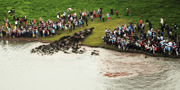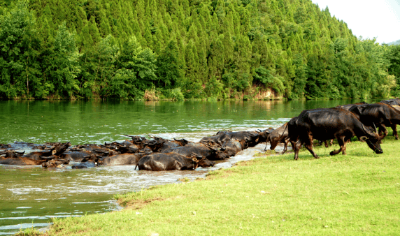 在四川省蓬安县嘉陵江河段上,每年5月到10月期间,每天都有数百头水牛冲入湍急的水中,浩浩荡荡游过宽阔的江面,为人们上演一场动物大迁徙的壮观景象。这道气势恢弘的生态奇观,被人们称为“百牛渡江”。尽管这一带水中没有鳄鱼、巨蟒、河马,岸上没有狮子、鬣狗、大象,但是,动物世界的爱好者们依然惊呼:“这里分明就是一个微缩版的坦桑尼亚塞伦盖蒂国家公园!”
