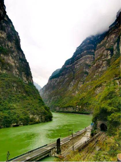 面对这样的风景,所有人都站在甲板上,悠闲地吹着河面的风。靠悬崖的一侧,有一条新修的公路,依山傍水,宛若在画中穿行。公路上的人与船上的人高声打着招呼,其实都不知道对面是谁。我想起初到这条大峡谷时,还只能站在半山腰,听脚下大渡河咆哮而过。那时候想一窥河流全貌都不可能,只能隐约看到脚下的河流卷起千堆雪。