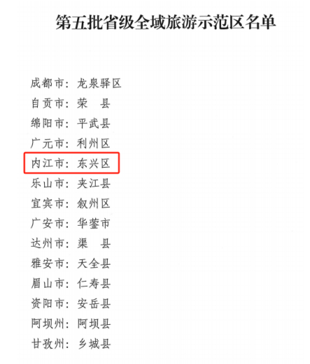 2024年1月9日,四川省文化和旅游厅组织开展第五批省级全域旅游示范区验收认定工作,根据综合考评结果和公示情况,决定认定内江市东兴区等14个县(市、区)为第五批省级全域旅游示范区。