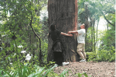 一同上山的两位女驴友,听我讲起这棵唐杉的故事,同声惊呼“哇噻”,登山兴趣大增。她们请陪同我上山的小伙子张仕华帮她们拍照留念,说:“一定要和千年树王合个影!”然后在树下摆各种造型,照了个够,才和我们作别,继续往山上攀登。