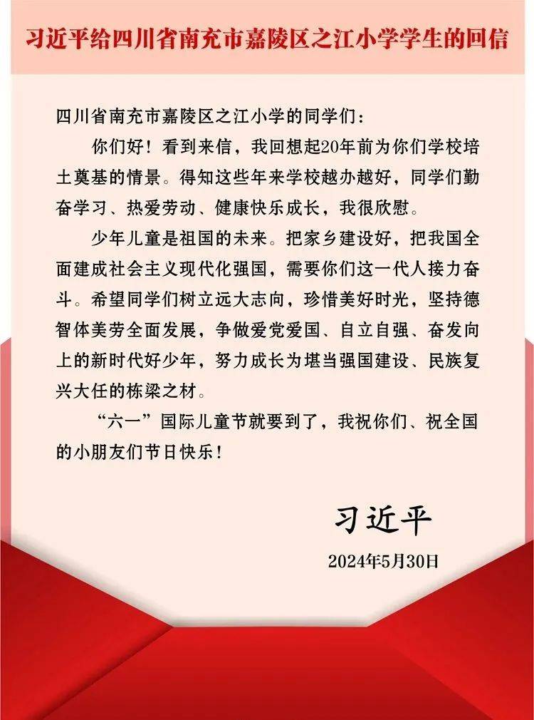 2024年5月30日习近平给四川省南充市嘉陵区之江小学的学生们回信(图源:新华网)