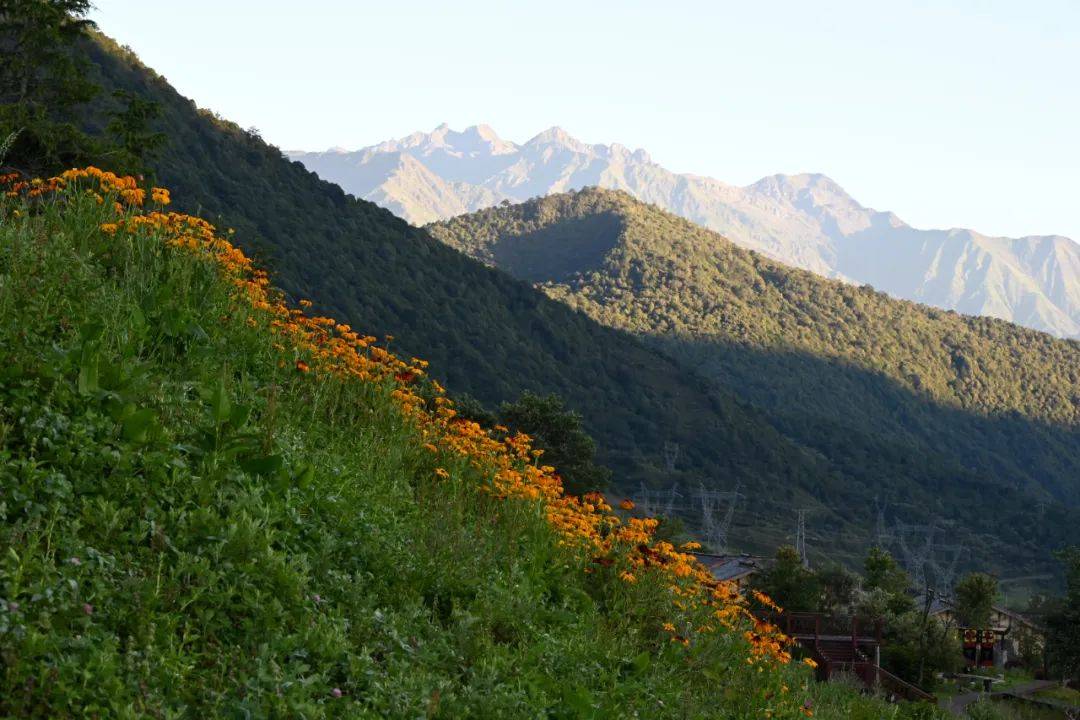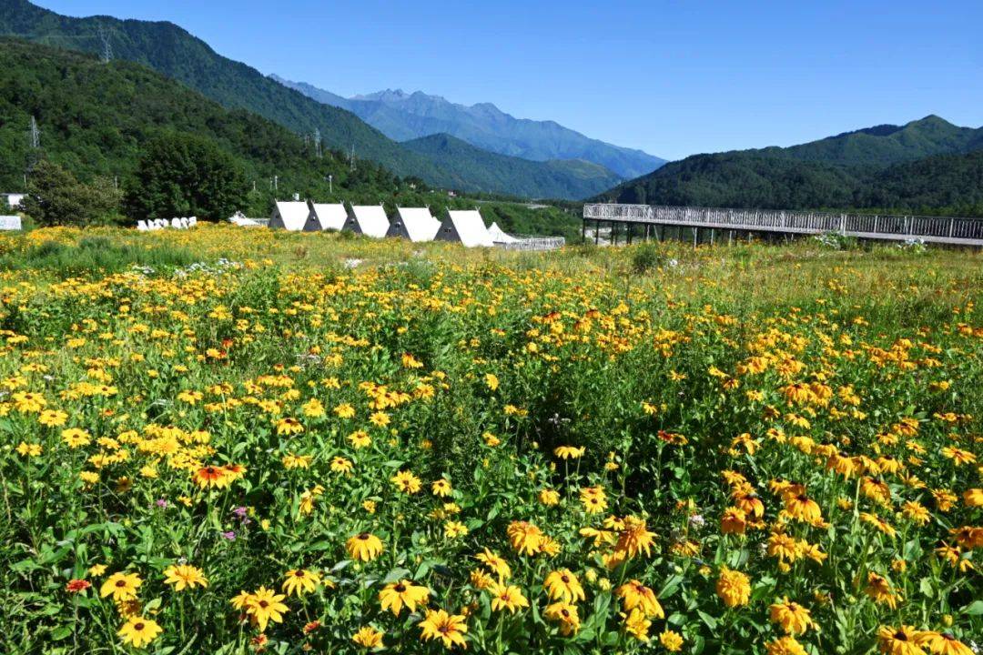 群山环抱下的花海、帐篷与观景栈道